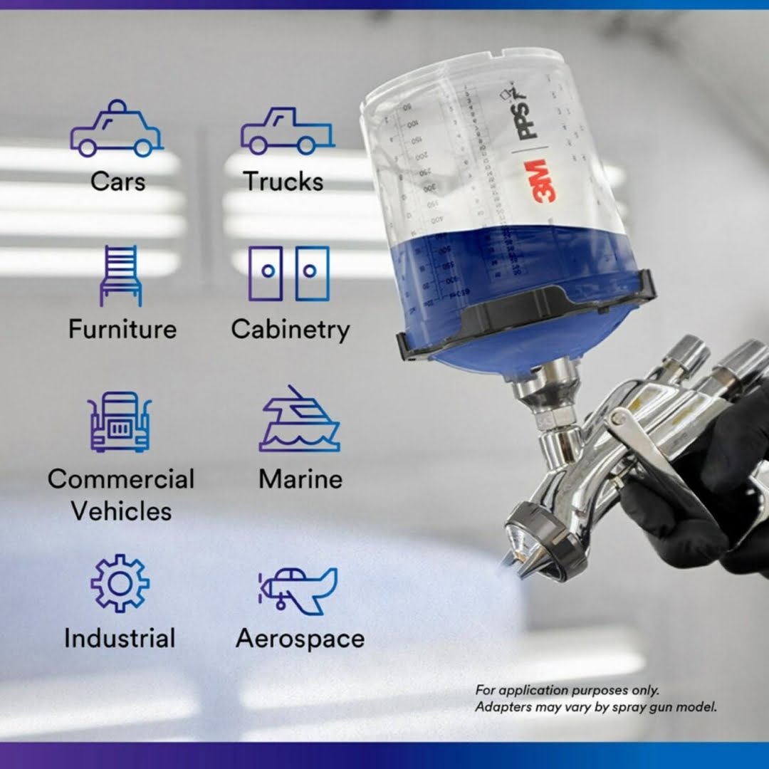 • El adaptador convierte prácticamente cualquier pistola aerosol de tapa en una que funcione con 3M ™ PPS ™ Series 2.0, nuestra próxima generación, el sistema de copa desechable de mayor rendimiento.