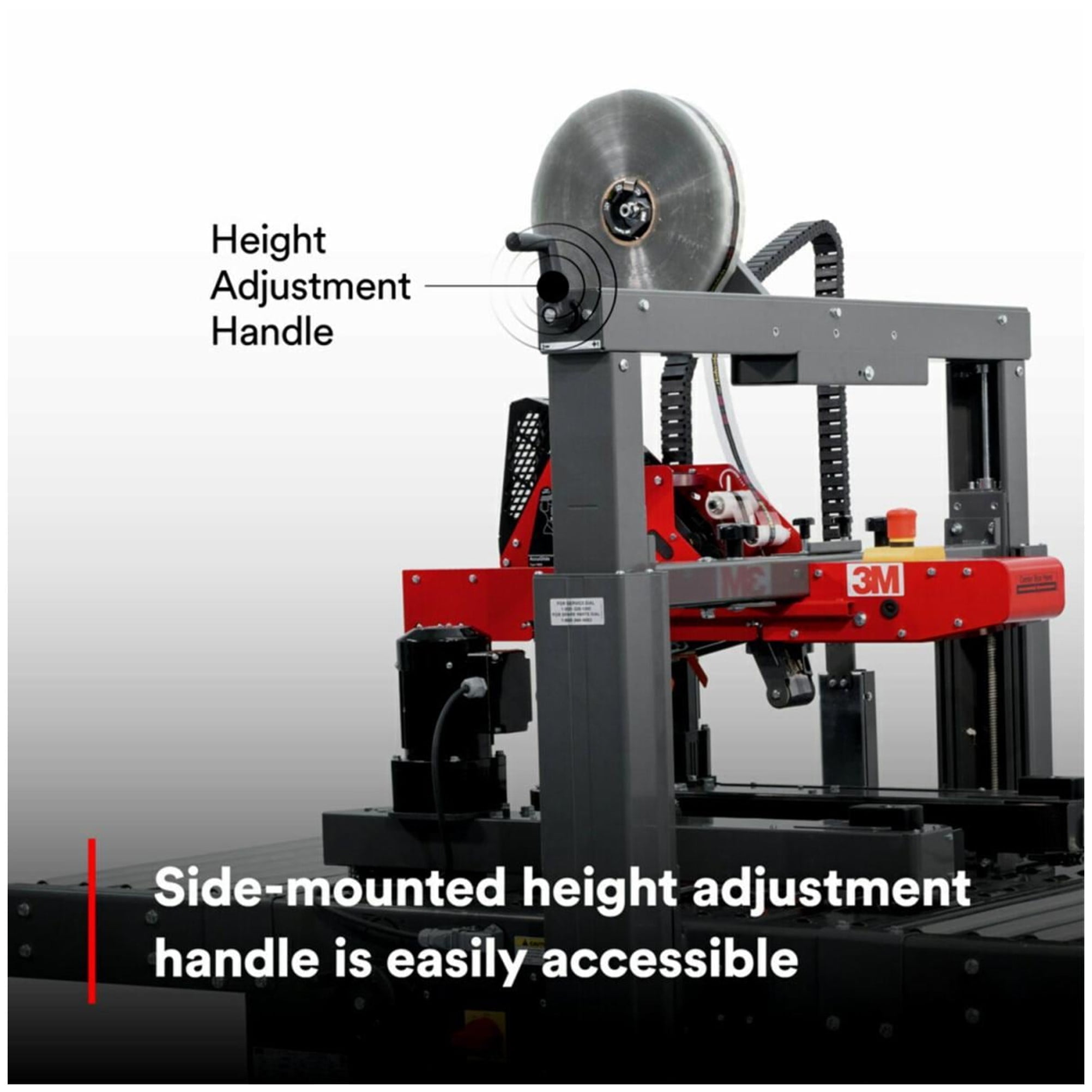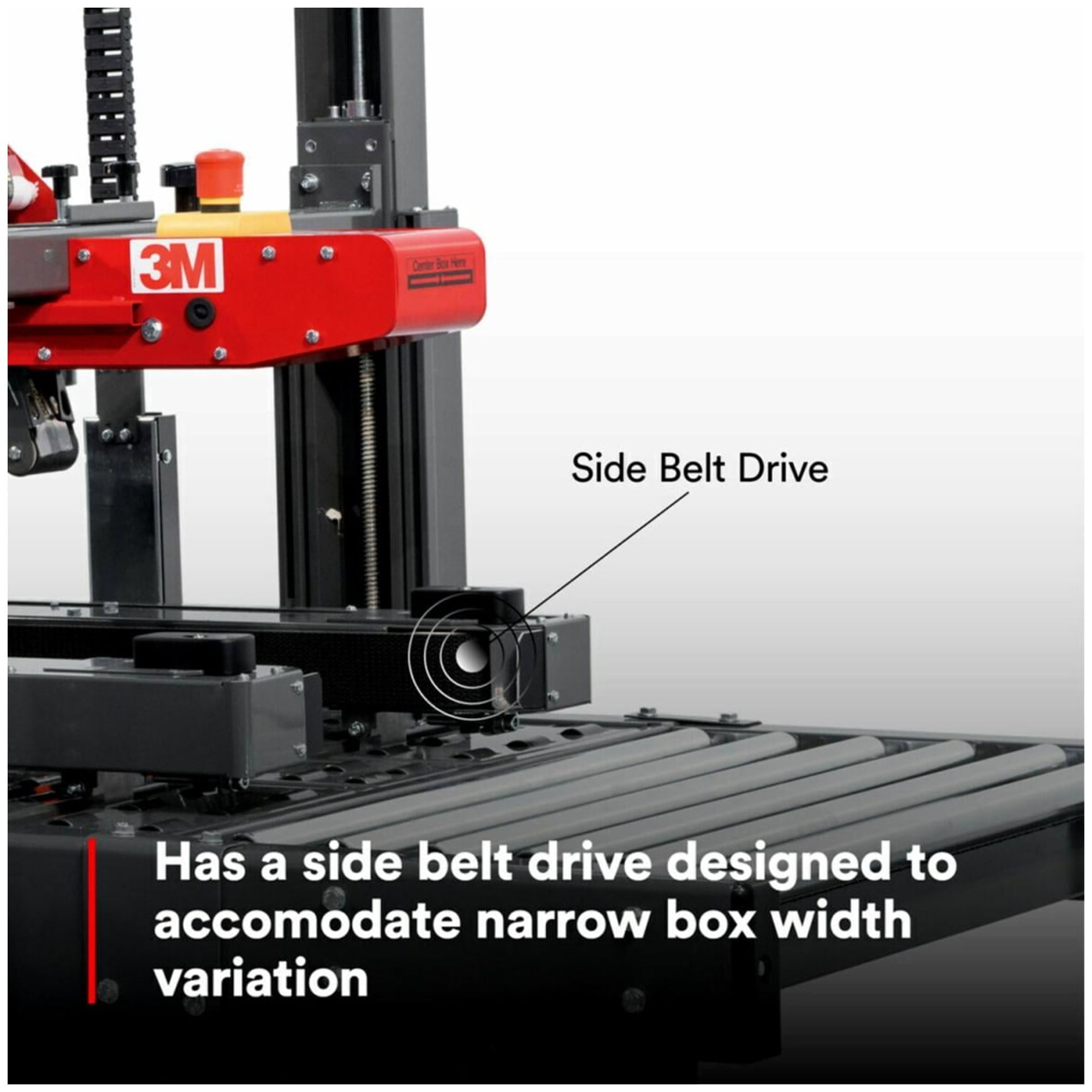 La 8000A/800A3 ofrece estabilidad en cajas de gran altura pero que son angostas, esto debido a su sistema de bandas a los lados que se ajustan de manera manual para dar una mayor estabilidad a este tipo de cajas, cuenta con un par de rodillos que ayudan a generar presión de la cinta y con esto tener un pegado uniforme de la misma.