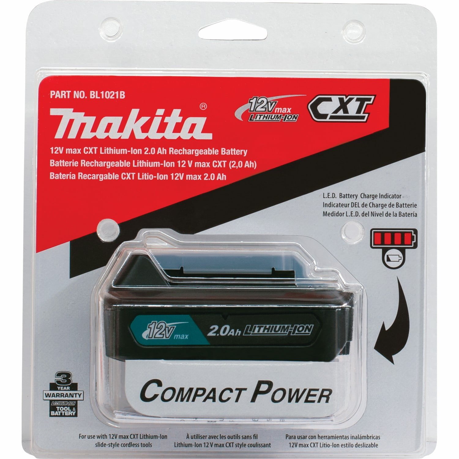 La batería CXT® Litio-Ion de 12V max 2.0Ah combina rendimiento eficiente con balance y ergonomía superior en una batería estilo deslizable y la conveniencia de un indicador L.E.D. de nivel de carga de batería intergrado. La batería CXT® de 12V max 2.0Ah (y la batería 4.0Ah, se venden por separado) se sitúan al centro de la serie expansiva de herramientas CXT® de 12V max de Makita, combinando rendimiento con ergonomía superior en un tamaño compacto. Las baterías CXT® Litio-Ion de 12V max pueden ser cargadas con un eficiente Cargador CXT® Litio-Ion de 12V max (DC10WD) de Makita.