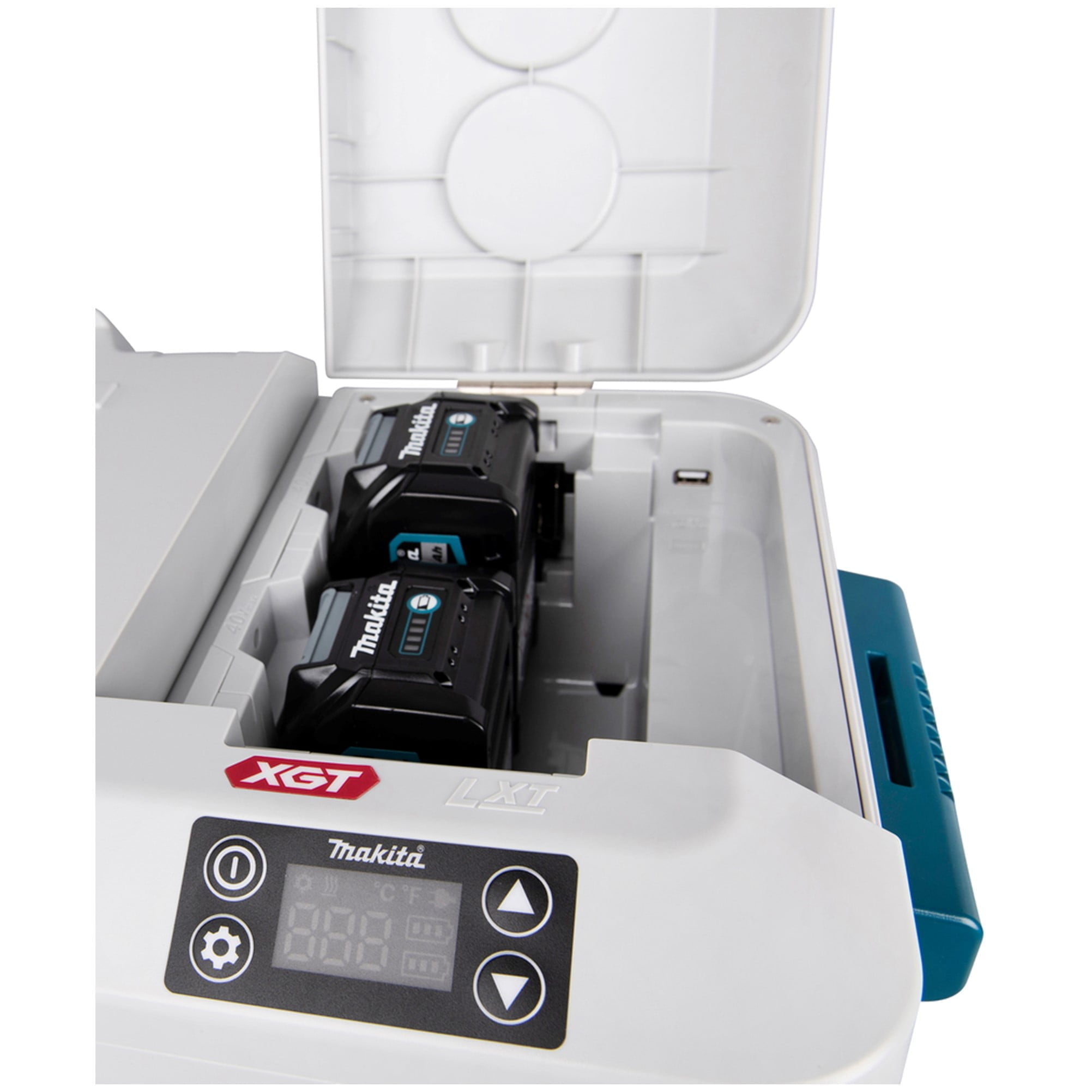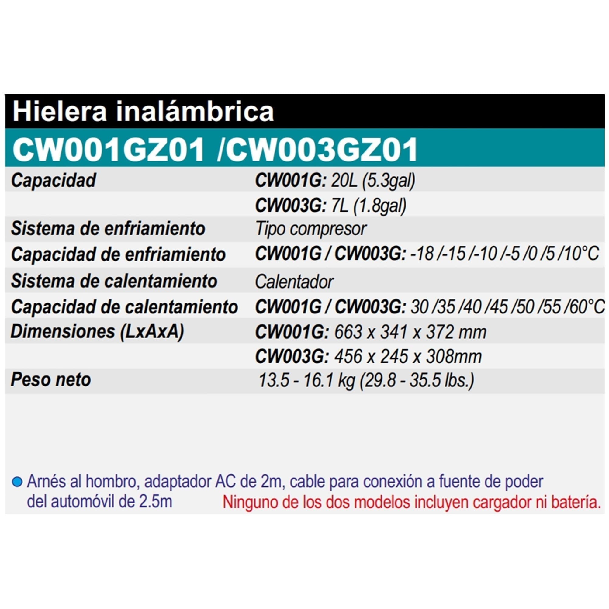 • La nevera/calentador CW001G mantiene su comida caliente hasta 8,5 horas o bebidas frías hasta 28 horas con 2 baterías XGT® 5,0 Ah. También se puede utilizar a través del encendedor del coche o de la red eléctrica (Ver baterías compatibles en las imágenes del producto).