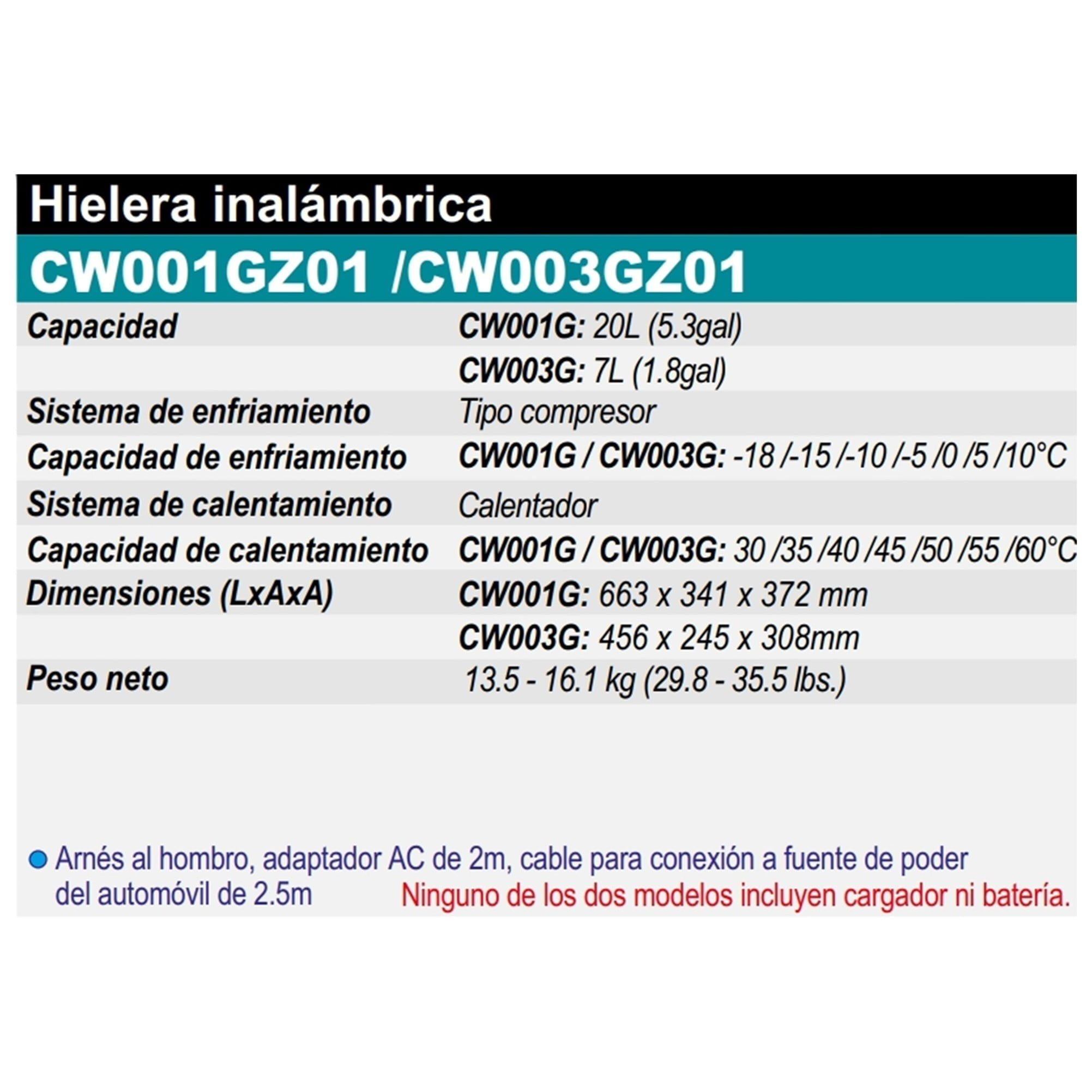 • La nevera/calentador CW003G mantiene por ejemplo su comida caliente hasta 5,5 horas o las bebidas frías hasta 13,5 horas con una batería XGT® 4,0 Ah (Ver baterías compatibles en las imágenes del producto).