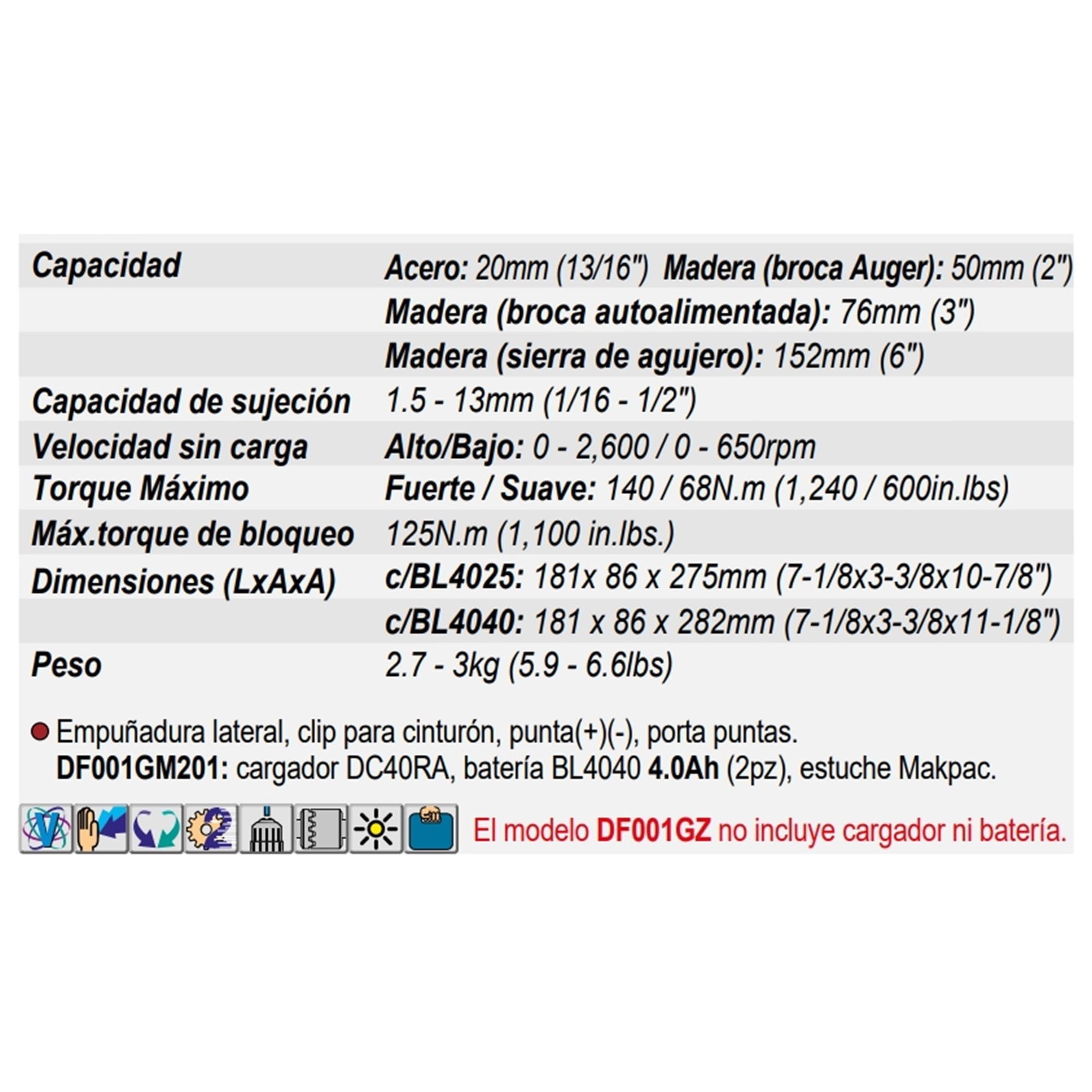 | Versión | DF001GM201, DF001GZ – Sin cargador ni batería |