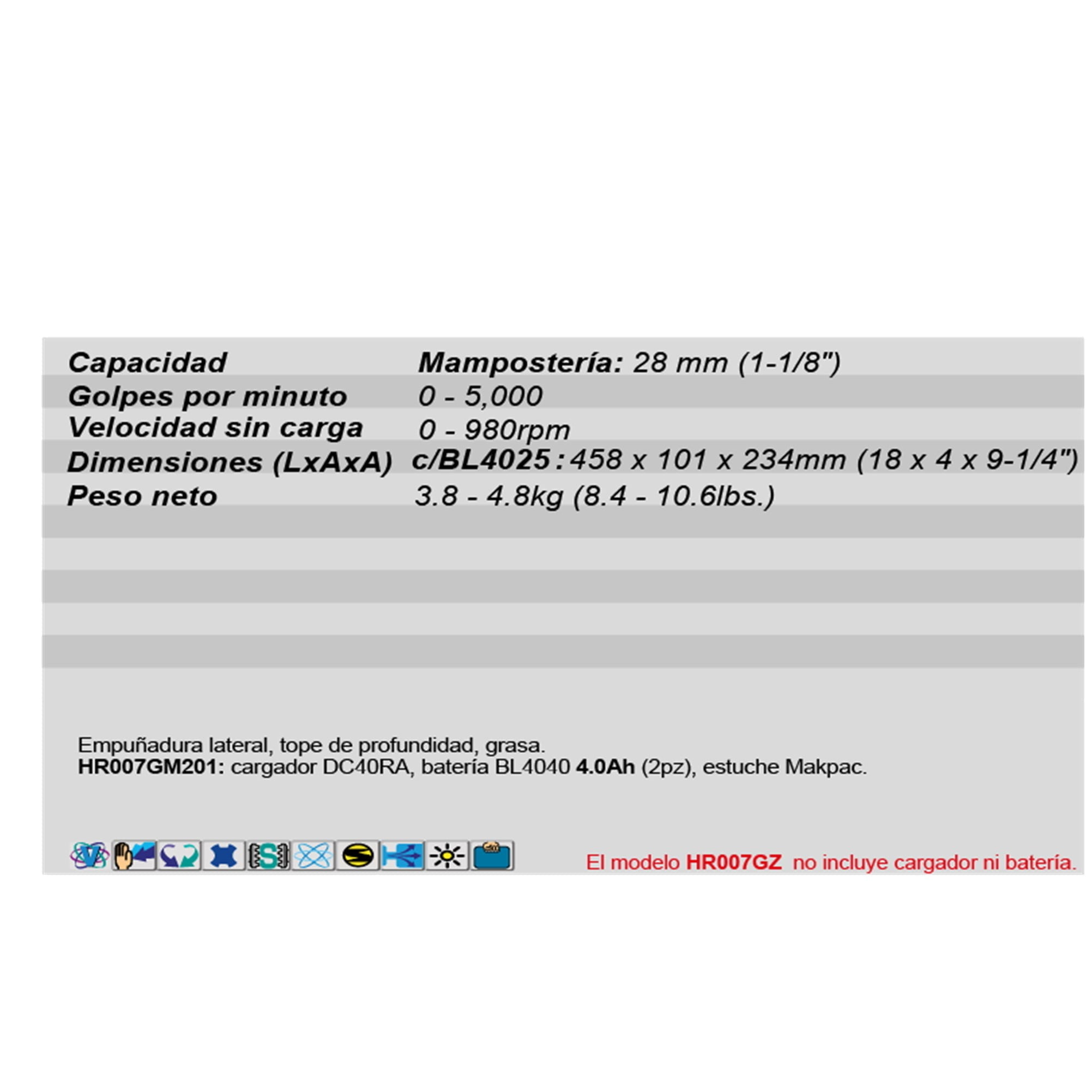 | Versión | HR007GM201, HR007GZ – Sin cargador ni batería |