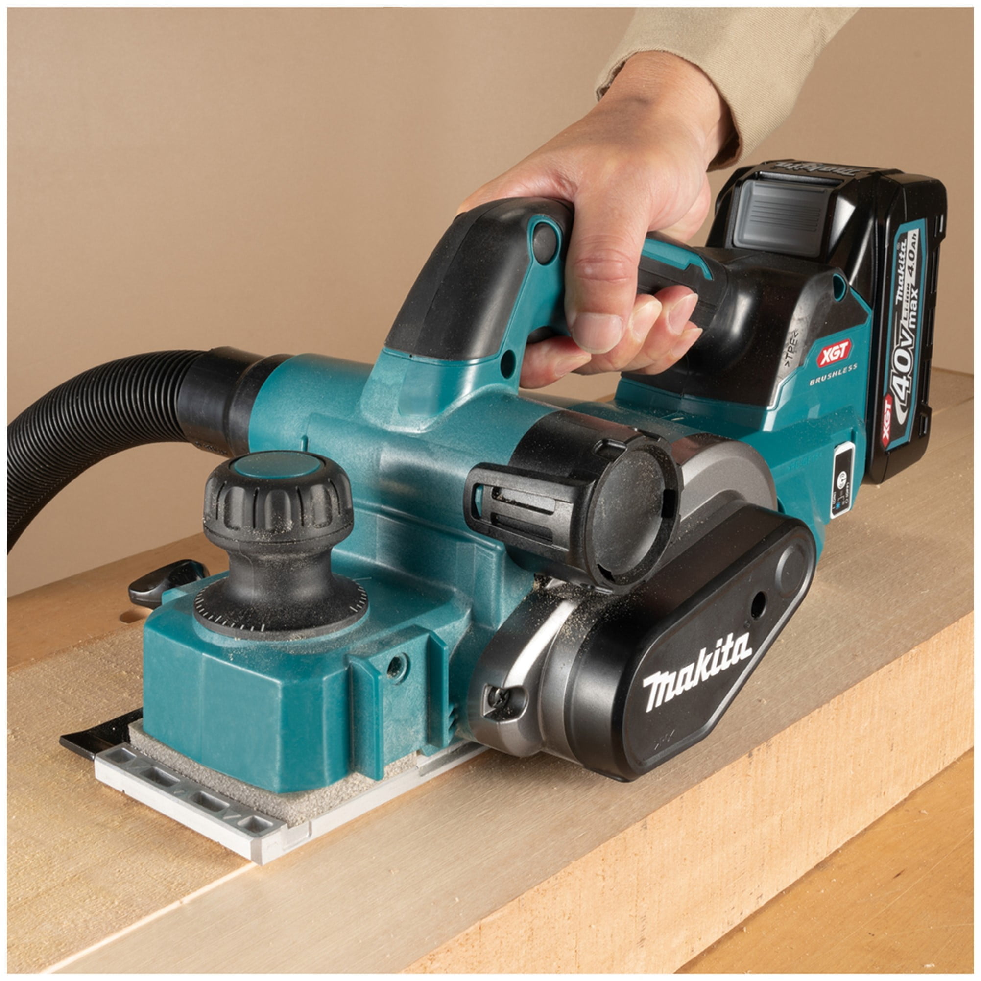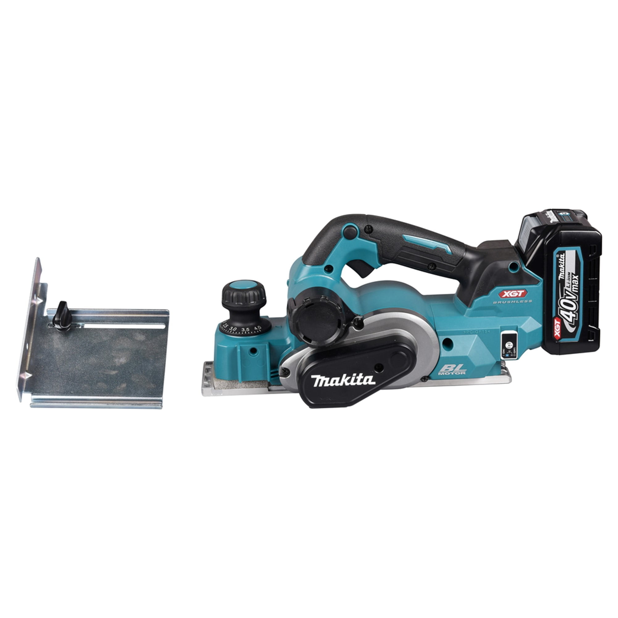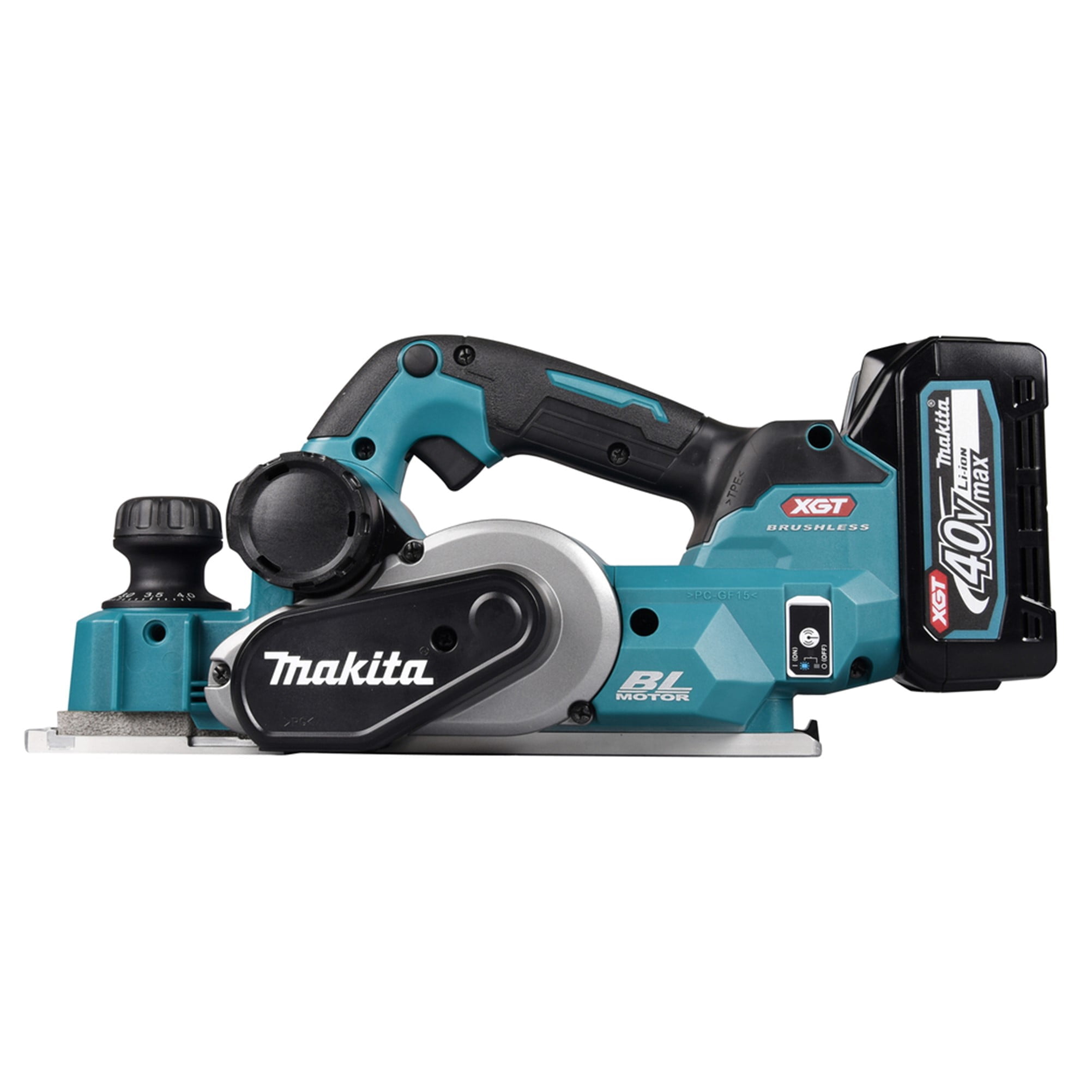 El KP001G cepillo XGT® tiene un cabezal de 2 cuchillas con hojas de carburo de doble filo para mayor rendimiento y suave acabado. La profundidad de corte se puede ajustar simplemente girando el pomo de la parte frontal de la herramienta para que el puntero señale la profundidad de corte deseada. También la expulsión de la viruta está habilitada por ambos lados.