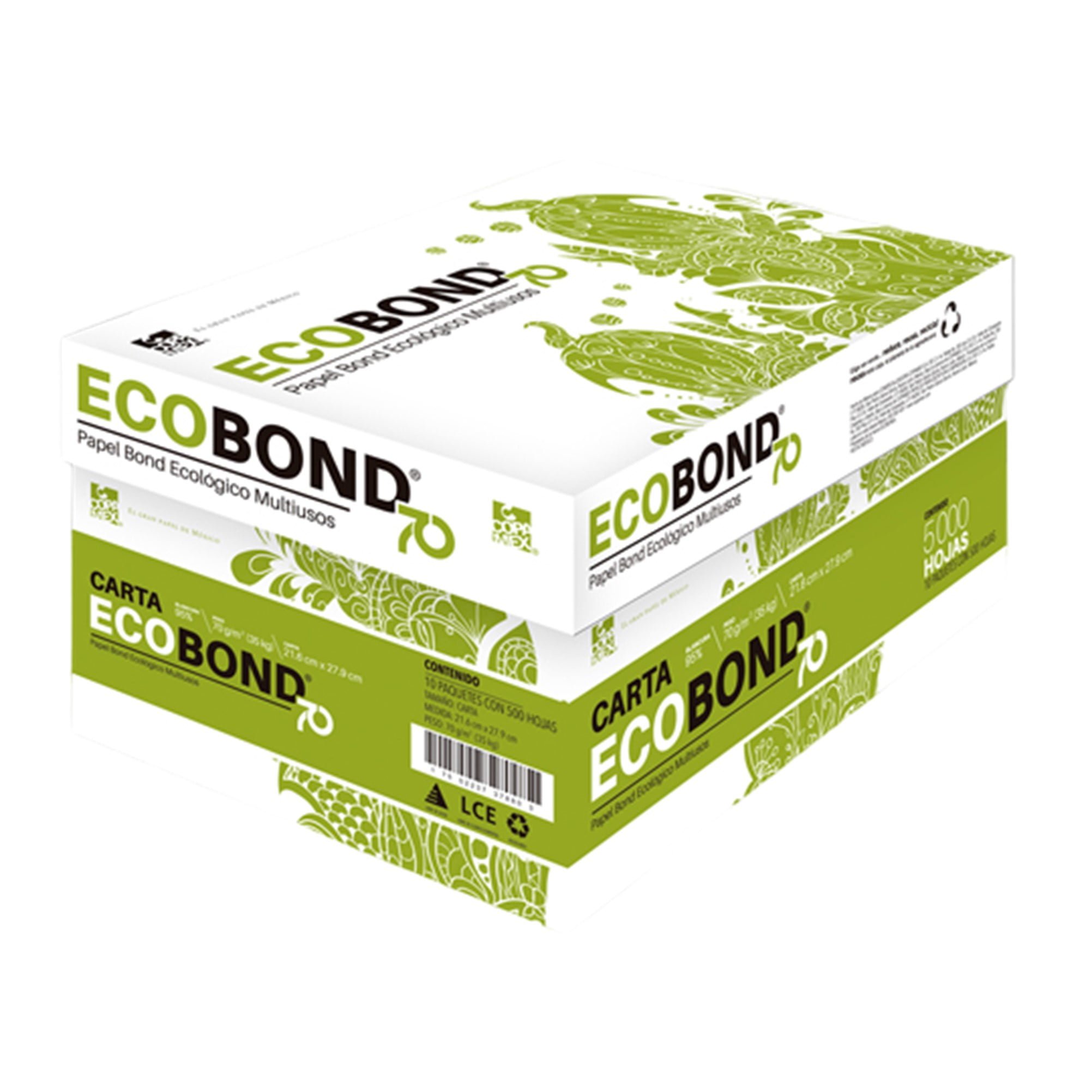 Hojas de papel bond ecológicas y reciclables multiusos, proceso de fabricación libre de cloro elemental. Con blancura del 95% y peso de 70g/m2.
