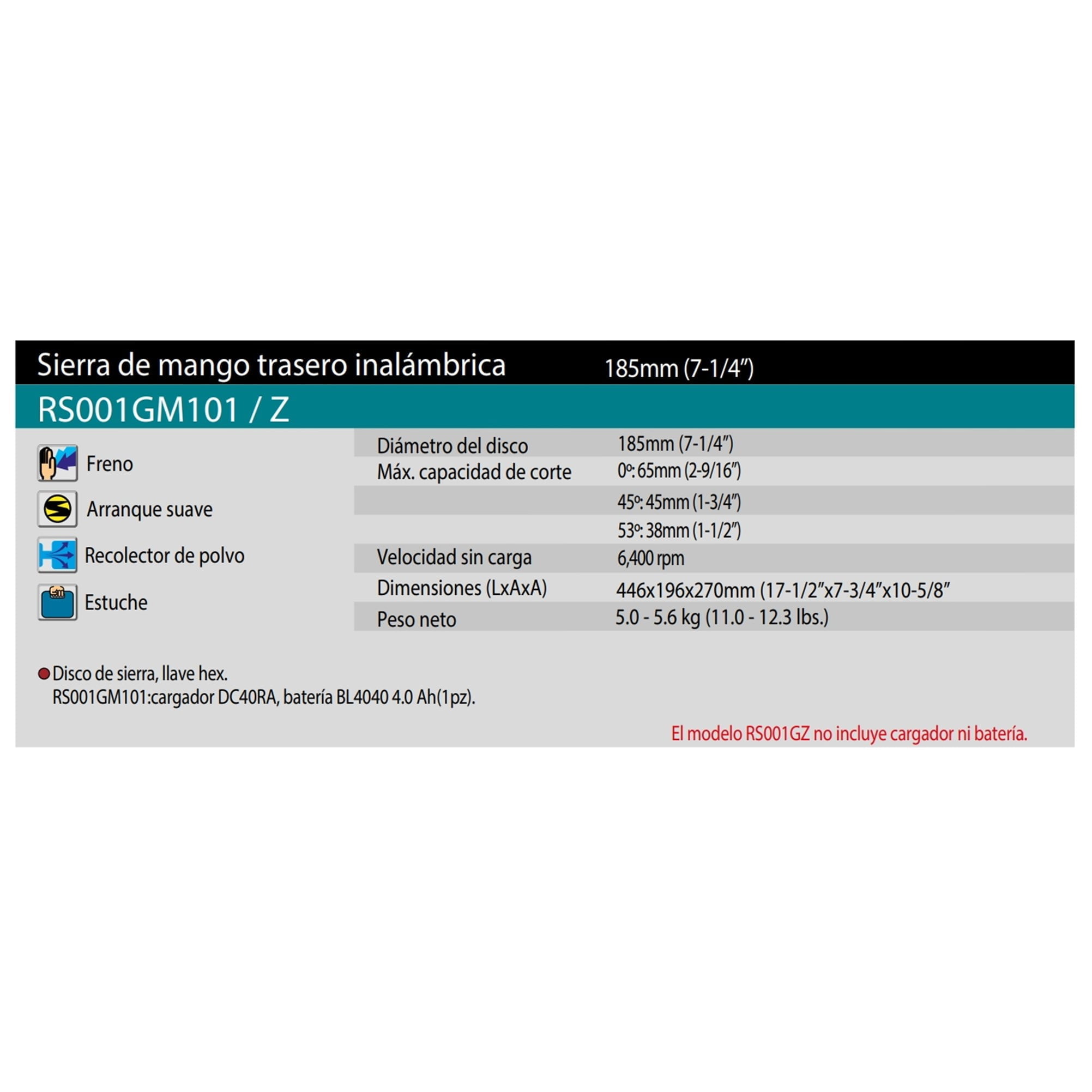RS001GM101/RS001GZ SIERRA DE MANGO TRASERO INALÁMBRICA 185MM (7-1/4”), 40V, 6400RPM´S