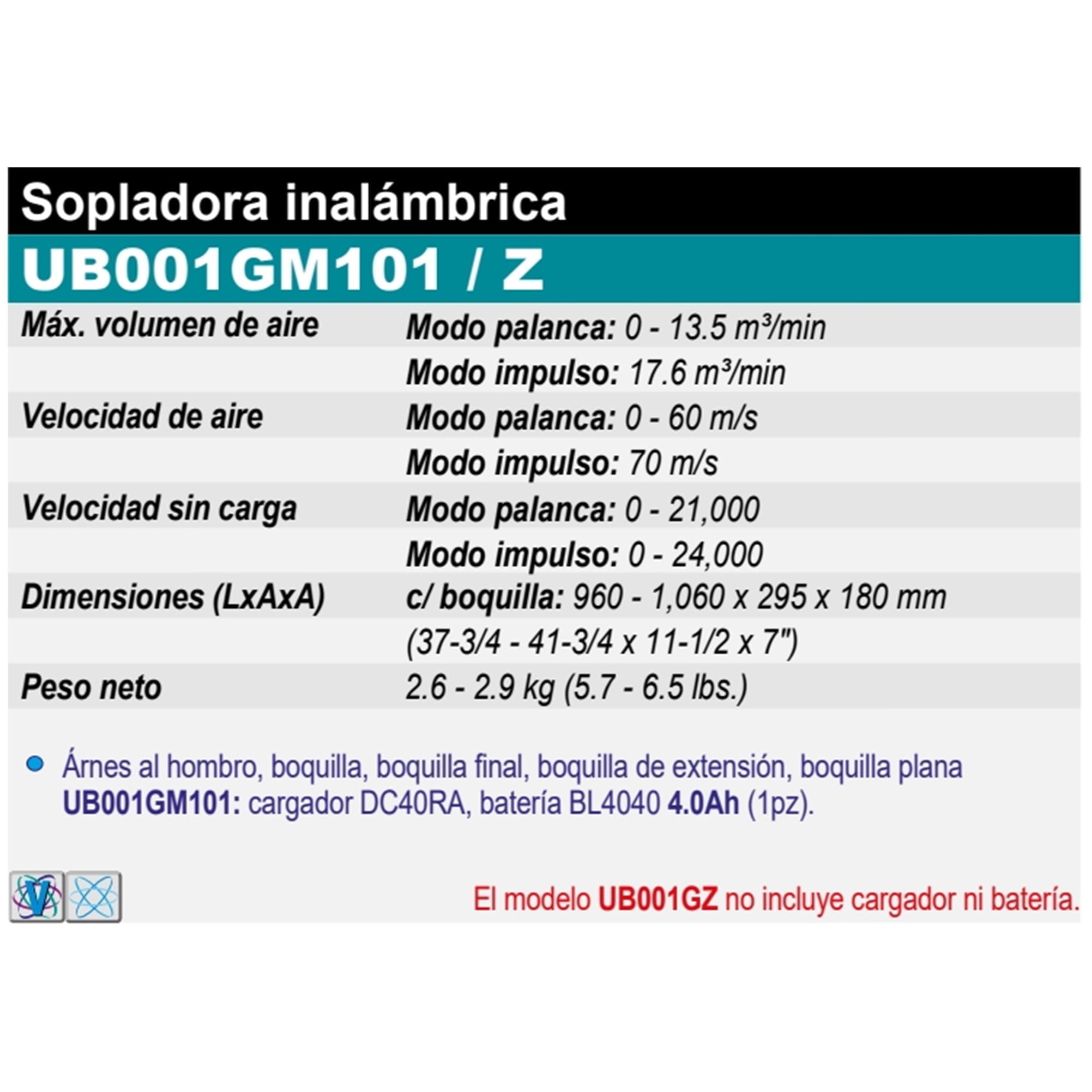 • UB001GM101: cargador DC40RA, batería BL4040 4.0Ah (1pz).